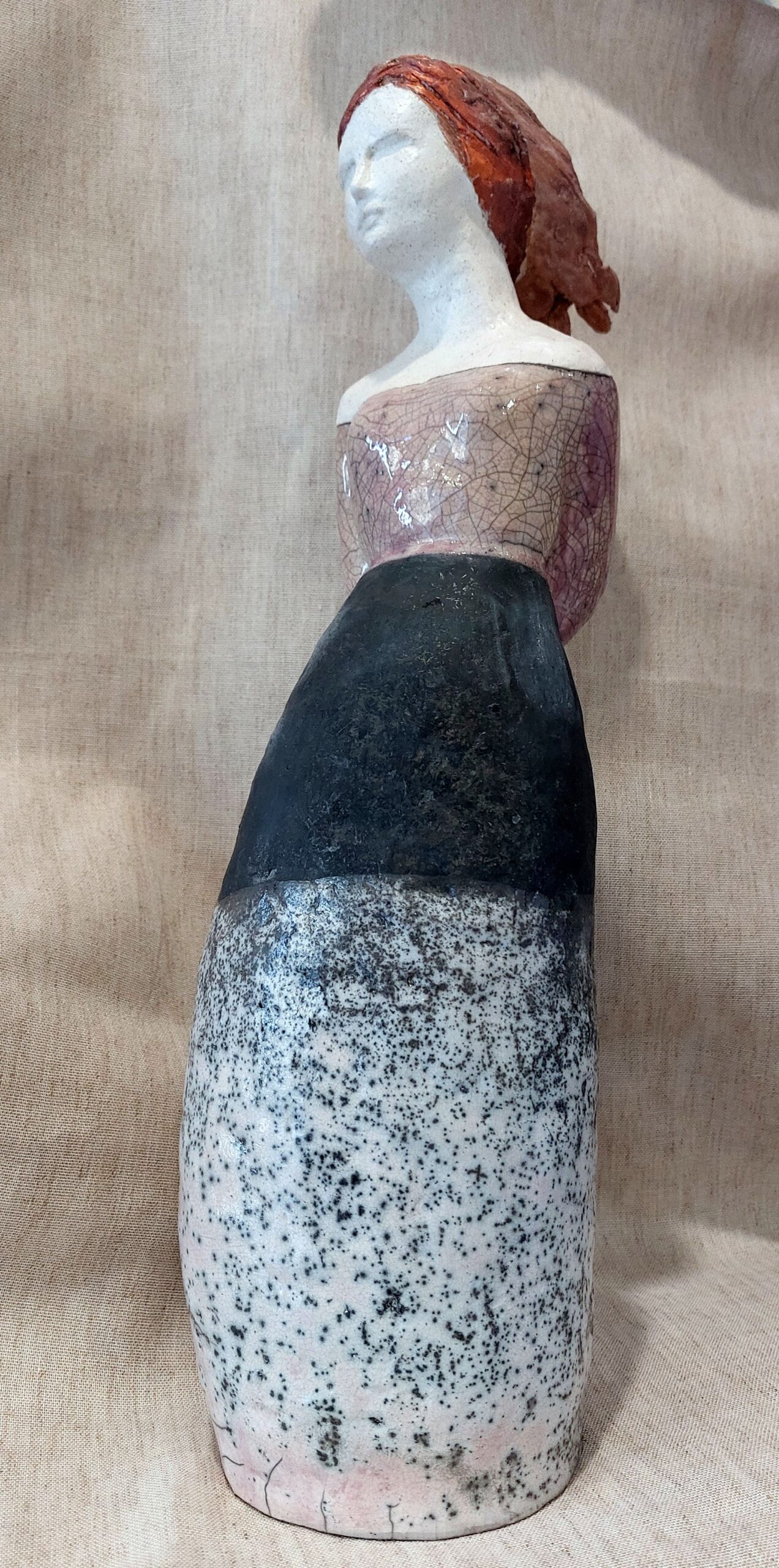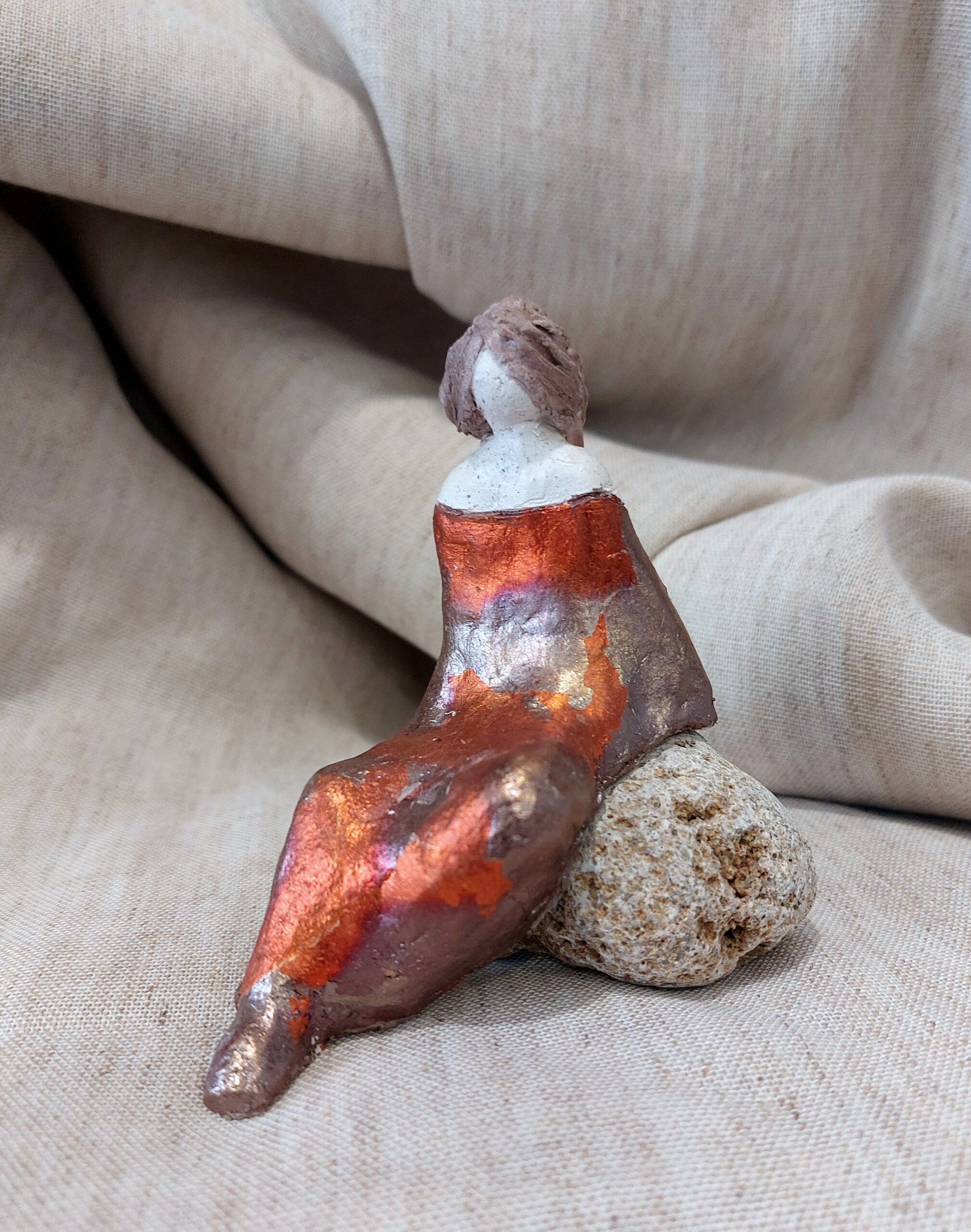 Forme di terra che raccontano l’umanità.Ogni figura realizzata è unica, porta antiche memorie e racconta tempi moderni. Vega, h cm.10, terracotta patinata a cera Sugli scogli dell’Accademia al tramonto,h cm. 9, terracotta con foglia di rame Demetra, raku, h cm. 42 La Ninfa ed il Fauno, terracotta patinata a cera con legno di mare, h. cm. 13 25 novembre, Raku, h. cm. 35 e 40 La casetta in cima al mondo, raku, h. cm. 12 Le amiche, refrattario su legno di mare, cm. 10×13 Aura, terracotta decorata a foglia, h. cm. 16 Aura – visione posteriore Noah, Raku, h. cm. 13 Katrine, Raku, h. cm 43 Sedute sul mondo, raku, h. cm. 12 Flora, Terracotta patinata a cera, h. cm. 36Giulia, ceramica raku, h. cm. 47Mafalda, ceramica raku, h. cm. 35 La lettrice, terracotta patinata a cera, h. cm. 26La lettrice in rosa, terracotta patinata a cera, h. cm. 12Gioia, terracotta patinata a cera, h. cm. 19 Marianna, refrattario, h. cm 14Marina, Refrattario con sasso, h. cm. 9Sognando sulla spiaggiaSognando sulla spiaggia (dettaglio)Susanna, refrattario con legno marino, h. cm 14 Lara, refrattario invetriato, h. cm. 13L'amica di Olga, Raku, h. cm. 32Angelina, Raku, h. cm. 20Gli innamorati: refrattario patinato h. cm. 20 Istanbul, refrattario dorato e patinato, h.cm.50 Lisette: refrattario patinato a foglia, h.cm.29 Risveglio, terracotta cerata, h.cm.54 Giovanna, refrattario patinato, cm.42×53 Farewell, raku, h.cm.63 Elena, refrattario cerato, h.cm.27 Effetto Venezia 2007, refrattario invetriato, h.cm.53 Dona Flor, terracotta dipinta, h.cm.18 Butterfly, terracotta smaltata, h.cm.29 Al Castello, raku, h.cm.60 A Niccolò, raku, h.cm.38 Istanbul (B) Istanbul (A), terracotta, h.cm.31 Giulietta, refrattario cerato, h.cm.44 Figura seduta, terracotta, cm.22×24 Eloisa, refrattario patinato, cm.23×24 Busto a due, terracotta cerata, h.cm.36 Bozzetto (B) Bozzetto (A), terracotta, h.cm.14 Attesa, terracotta cerata, h.cm.34 Anna verrà, terracotta cerata, h.cm.30 Caterina, refrattario e legno, cm.32×72 coll. privata Con l’abito delle feste, terracotta invetriata e dorata, h.cm. 25 Demetra, cm. 16×19 Il vestito di Marta, h.cm. 22